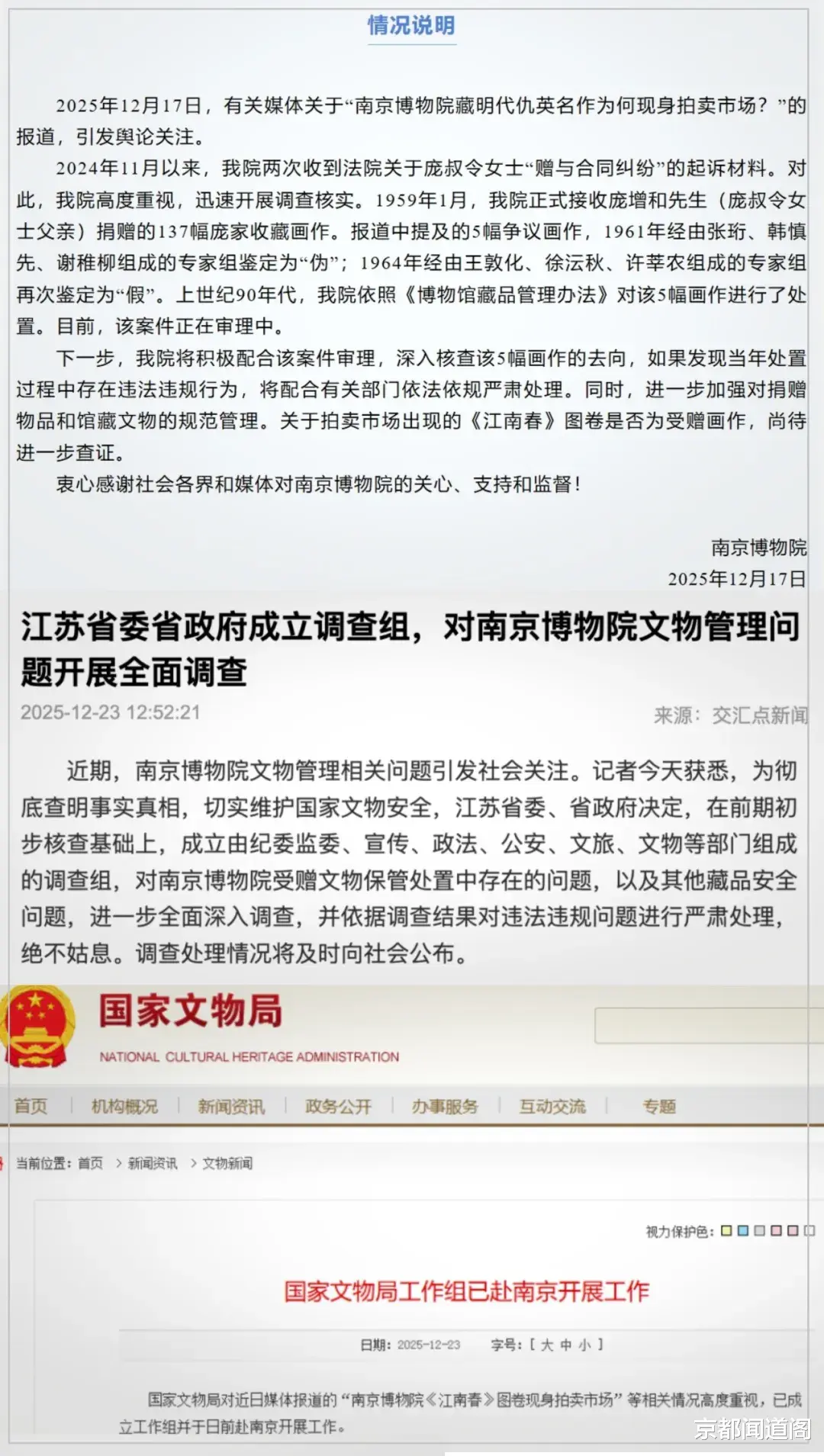 12月23日,江苏省委、省政府宣布成立由多部门组成的调查组,对南京博物院文物管理问题展开全面调查,承诺将依据调查结果严肃处理、绝不姑息,并及时向社会公布。这回应了公众积压已久的追问,也折射出文物安全背后深层次的信任危机。