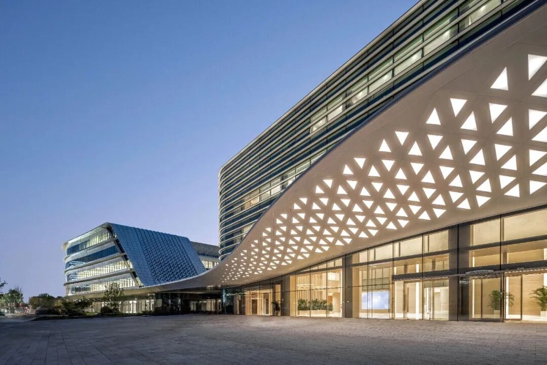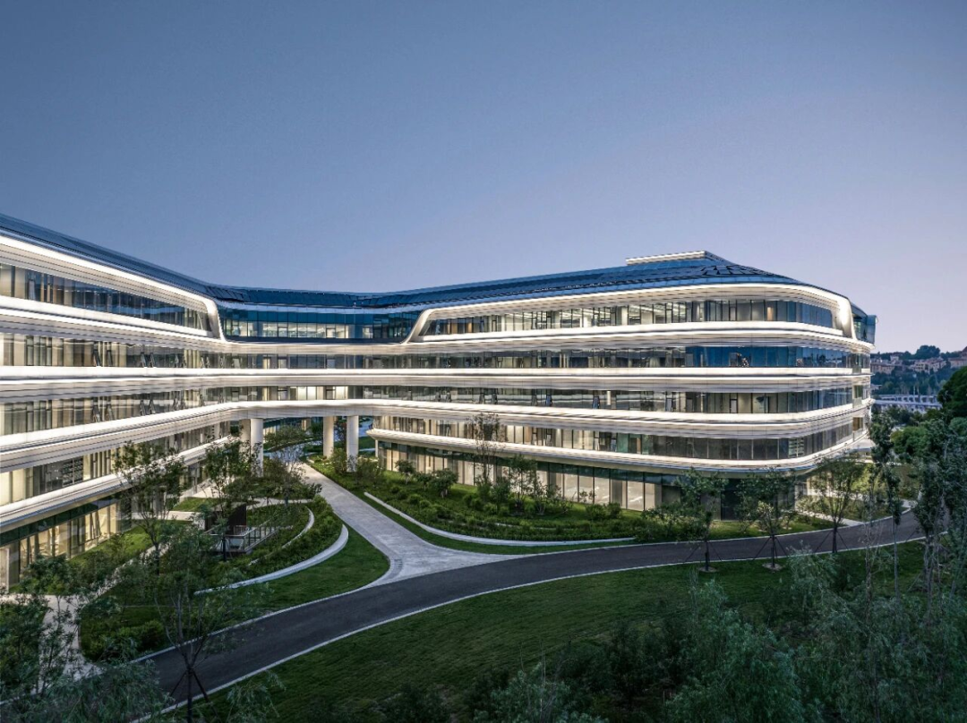 立面通过立体幕墙营造出节奏感,夜晚LED光带如流转的卫星轨迹,为建筑注入灵动气息。入口处张力十足的大悬挑,既像张开的手臂迎接来客,也喻示企业面向未来的开放姿态。