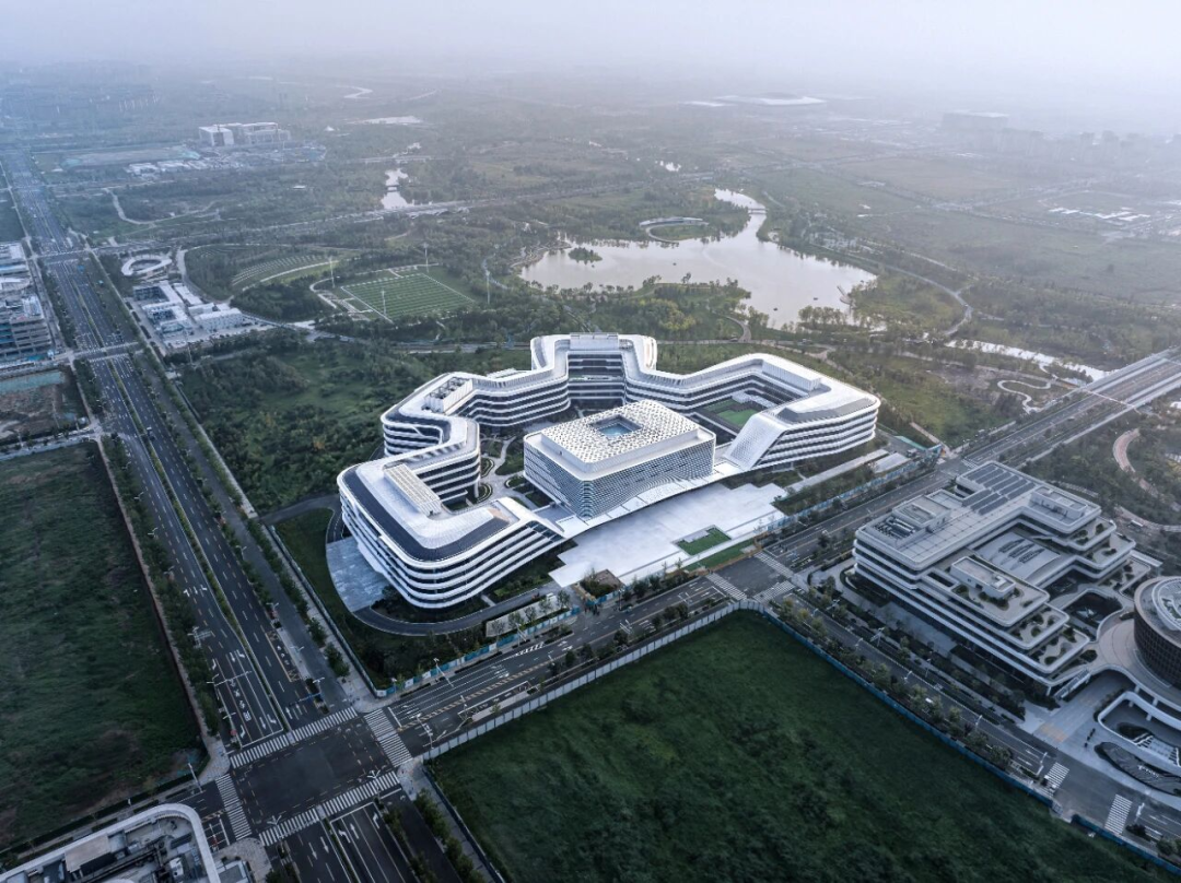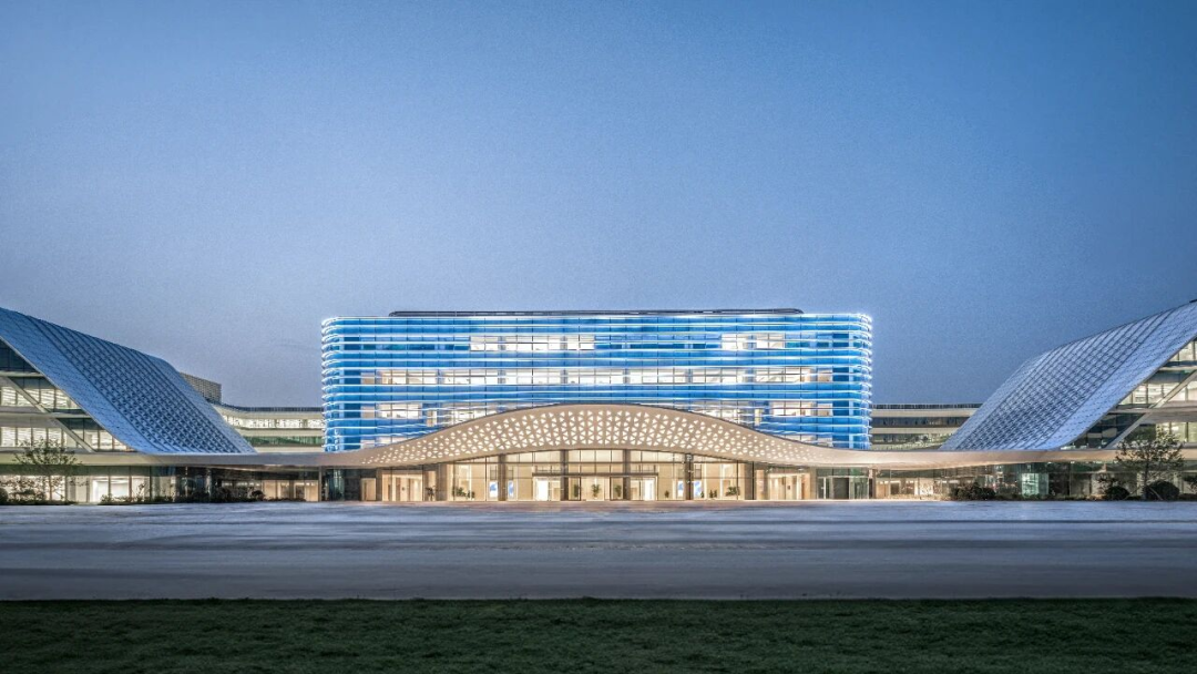 在建筑形式方面,设计锚定卫星互联网“链主”定位,将代表传统文化的“玉琮”建筑形态与代表科技意象的“星轨”融合,集成“玉琮之韵,星轨之智”的建筑意象。