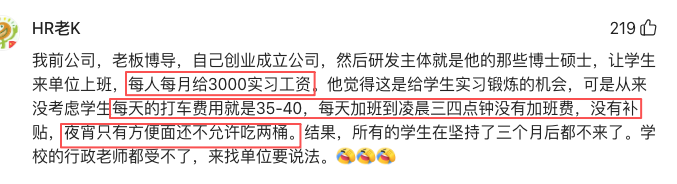 咱们先不谈情怀,光看评论区里那个被顶到高赞的真实案例——网友@HR老K 说:他前公司老板也是博导,把学生拉去单位当主力,每月给3000元实习工资。听着不少吧?可在一线城市,每天打车费就40块,加班到凌晨三四点没加班费,连吃两桶方便面都要被嫌弃“吃得多”。结果研究生干了3个月都跑了,学校行政老师受不了,找单位要说法。