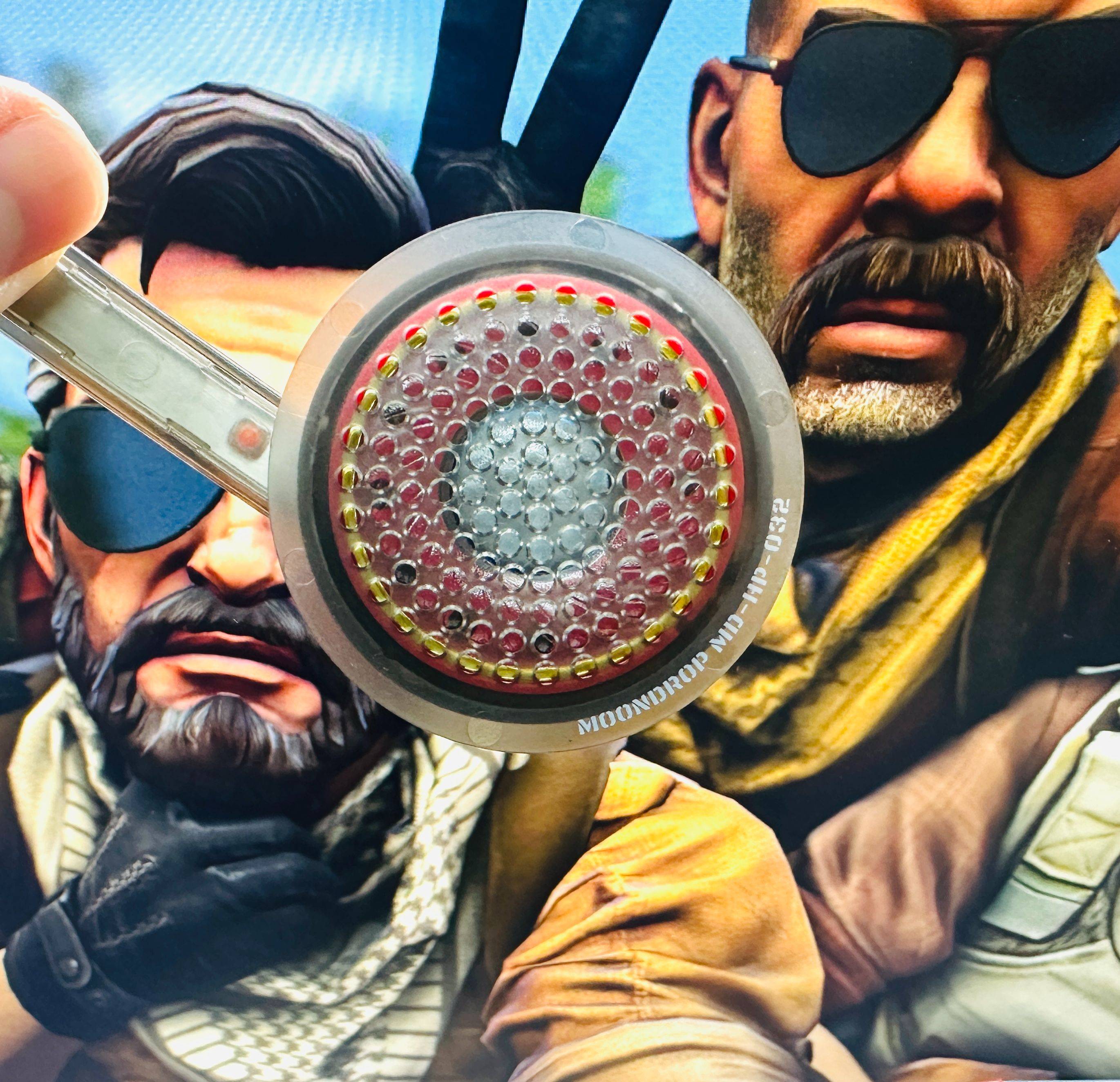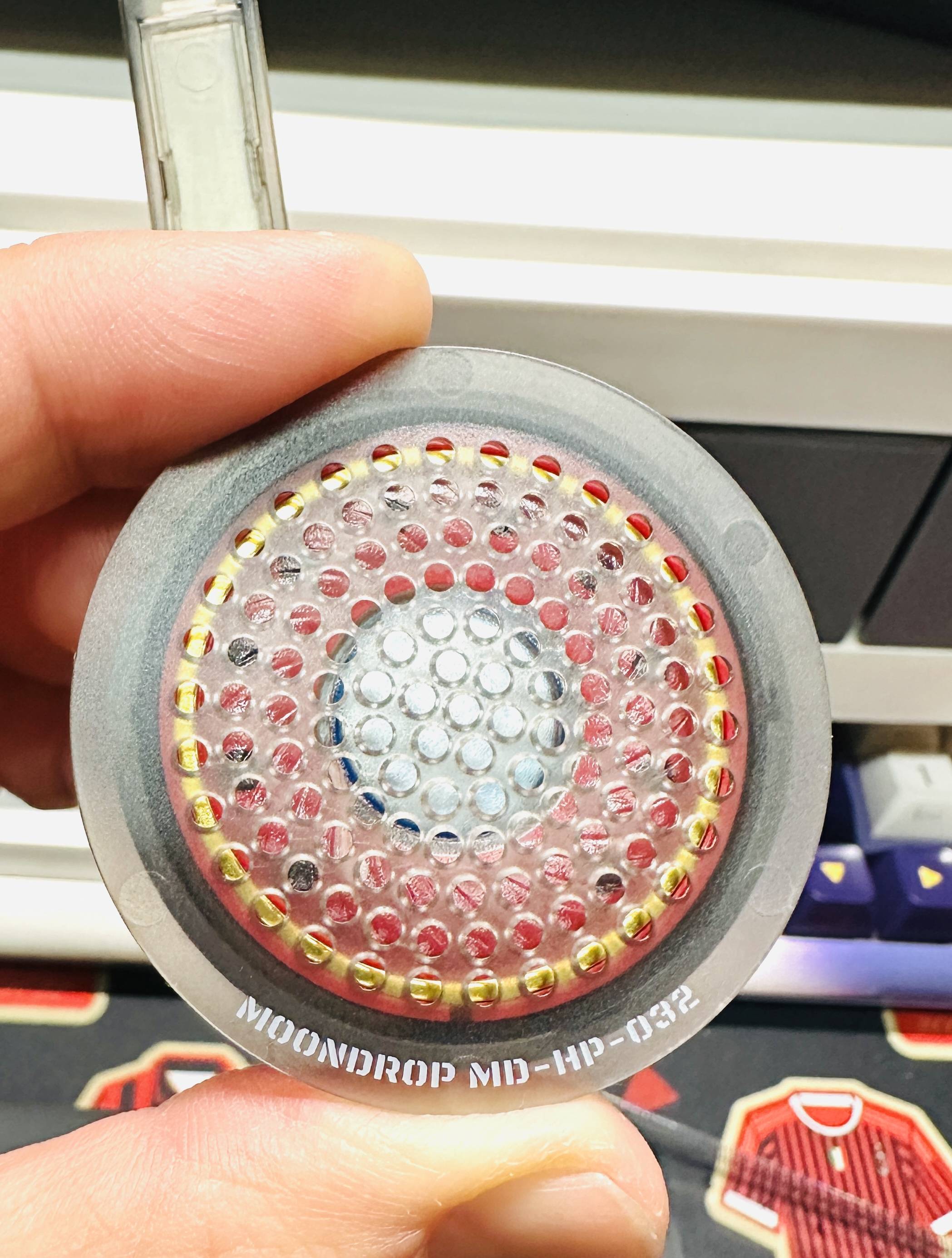 单元表面以红、银、金三色点缀,搭配这克制有序的点阵,古朴精致感扑面而来;连“MOONDROP MID-HP-032”的标识都印得清晰规整,细节里满是老派音频设备的腔调。