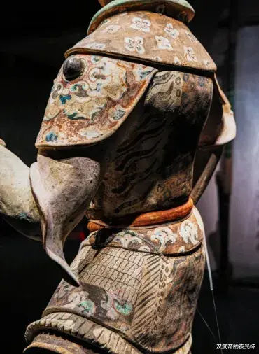 俑身的彩绘工艺更是精妙绝伦。工匠以红、黑、白、蓝等矿物颜料为色料,在陶胎上精心绘制出花纹、云纹和衣纹,色彩搭配和谐,线条流畅细腻。红色勾勒衣纹轮廓,黑色渲染毛发细节,白色填充底色,蓝色点缀花纹,多种色彩相互交融,形成丰富的层次感。甲泡与束带间的金箔虽有部分脱落,但残留的碎片依然能看出当年的华贵。考古专家介绍,这种先素烧成型、再施彩绘、最后局部贴金的工艺,是唐代彩绘陶俑的典型特征,需要经过多道工序才能完成,对工匠的技艺要求极高。