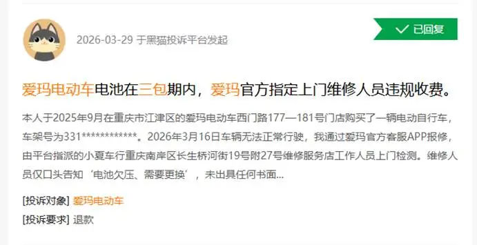 黑猫投诉平台显示,有用户通过官方APP报修后,维修人员口头上说电池欠压,收了550元换电池的钱,并没有给出检测报告或者故障原因。类似事件暴露出爱玛总部对终端服务网点在实际操作中存在监管盲区,也影响到消费者对品牌服务体系的信任。
