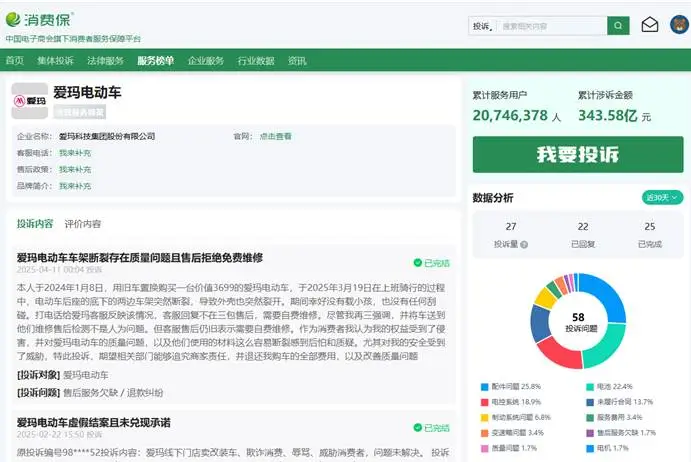 根据消费保平台的统计数据,从2025年1月到2026年3月之间,爱玛总共收到投诉308起,在电动车行业中位列第三。这一数字背后,不仅是庞大的用户基数和销售网络的直接体现,更暴露出其服务链条中的薄弱环节。