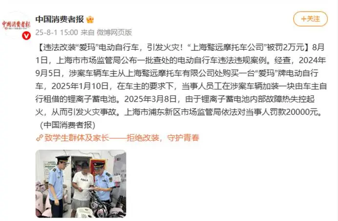 2025年8月,上海骛远摩托车有限公司在浦东新区设立的“爱玛”门店,因车主要求加装锂电池而引发车辆起火事故,该门店被浦东新区市场监管局依据《上海市非机动车安全管理条例》第四十二条处以罚款两万元。