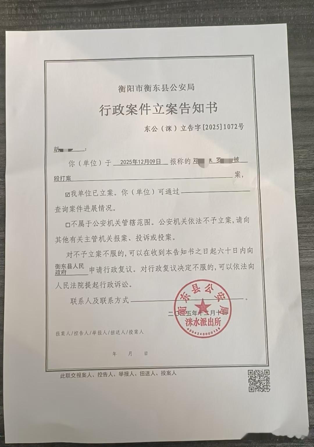 最新进展这案子已经进入了警察那边的程序。衡东县公安局洣水派出所2023年12月10号出了份《行政立案告知书》,就是关于小邓、小罗两个人被打的事,办案还在继续推进着呢。