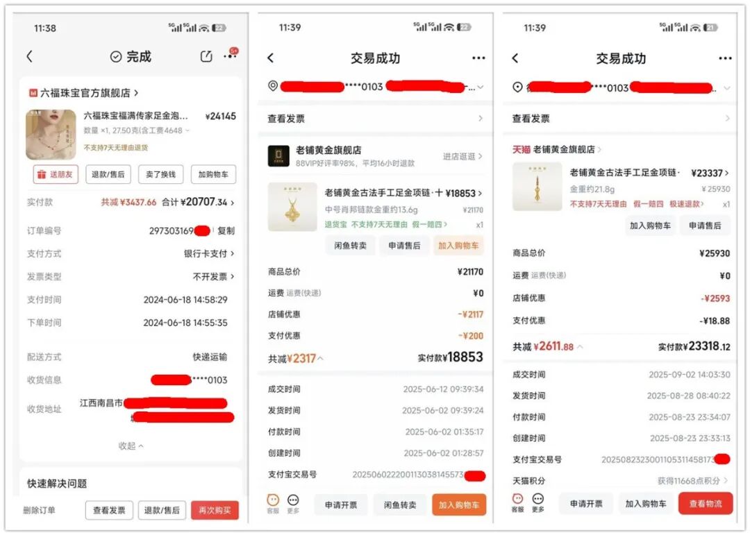 去年618六福27.5克金项链花了2万元,现在涨到4万多块。老铺13.6克金项链今年618花了1.88万元,如今涨到2.98万元,老铺21.8克金项链8月花了2.3万元,如今涨到了3.7万。