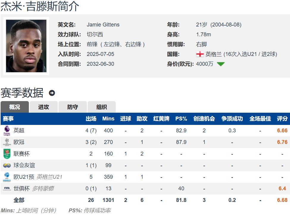 在欧冠联赛阶段第6轮的比赛中,切尔西客场1-2遭亚特兰大逆转落败。此役,切尔西新援、英格兰边锋吉滕斯首发出战并踢满全场,1次射门1次射正,5次尝试过人其中3次成功,但9次丢失球权。赛后,媒体给吉滕斯打了6.4分,看起来是碌碌无为。