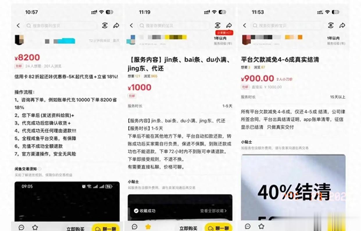最近打开闲鱼,这类“高折扣还贷”广告几乎藏不住:“信用卡82折起”“欠款减免4-6成”“APP账单清零+征信结清”,甚至有商家直接举例“欠平安2万还8千,欠招行3万还1万5”。折扣力度大到离谱,可这“天上掉的馅饼”,真能捡吗?