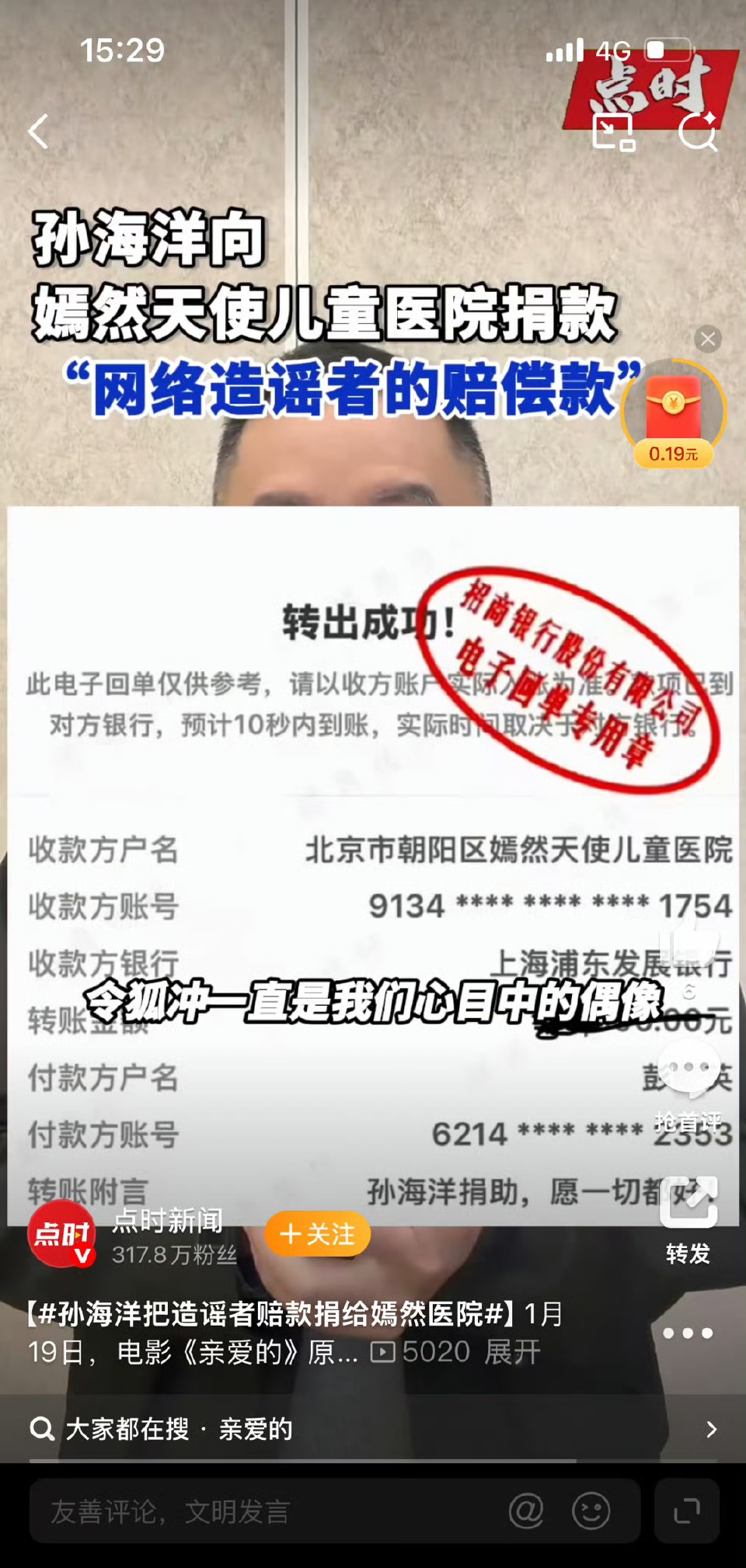 近日,孙海洋向陷入关停危机的嫣然天使儿童医院捐款,迅速引发热议。这笔钱,竟来自网络造谣者对他的赔偿款;而收款方,正是一家因拖欠2000万租金面临生存危机的民营公益医院。这一举动,是纯粹的孩子善意,还是对舆论风波的巧妙回应?孙海洋的捐款,无疑为嫣然医院带来了急需的舆论支持。