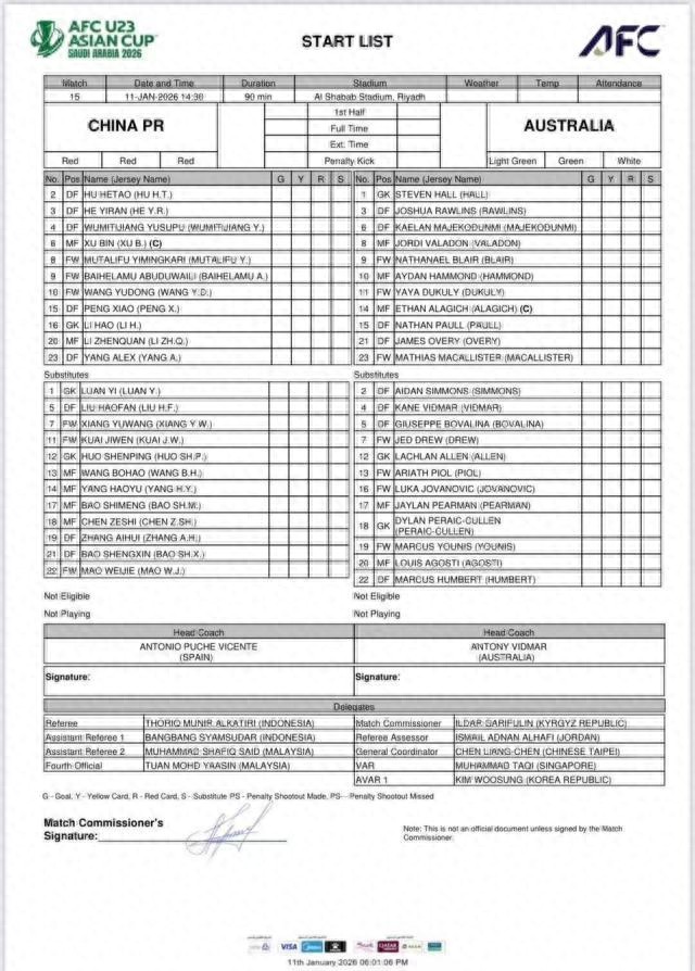 澳大利亚U23首发:1-斯蒂文·霍尔、3-罗林斯、6-马耶科杜米、15-内森·波尔、21-奥弗里、8-瓦拉东、14-阿拉吉奇、11-杜库利、10-哈蒙德、23-马蒂亚斯·麦卡利斯特、9-布莱尔