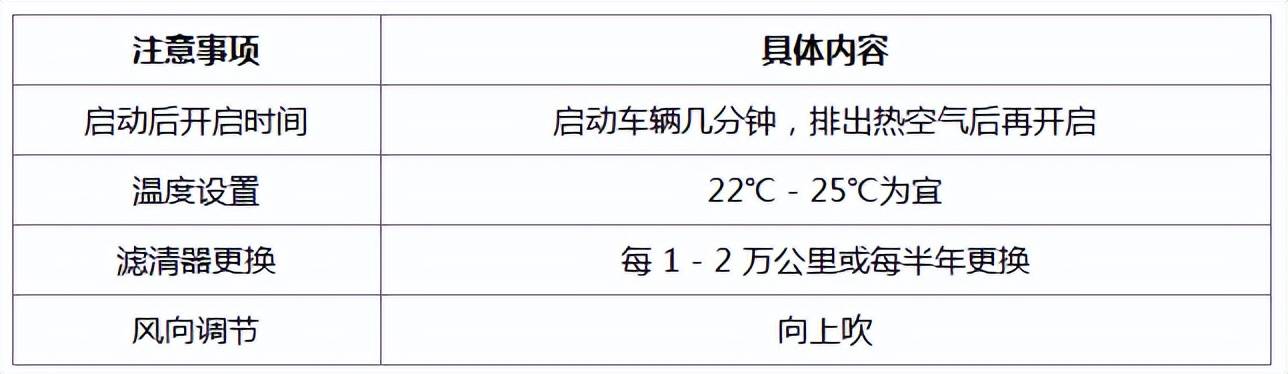 以下是一个简单的表格,总结了夏季汽车空调使用的关键注意点: