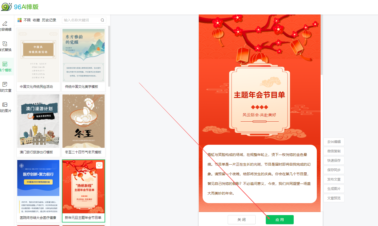 输入推文主题(如“考研复习规划”“618促销活动”),AI会从180万+免费模板库中推荐整套样式,包含标题字体、正文配色、分割线等元素。点击“一键应用”即可完成排版,新手也能排出媲美《人民日报》新媒体的专业样式。