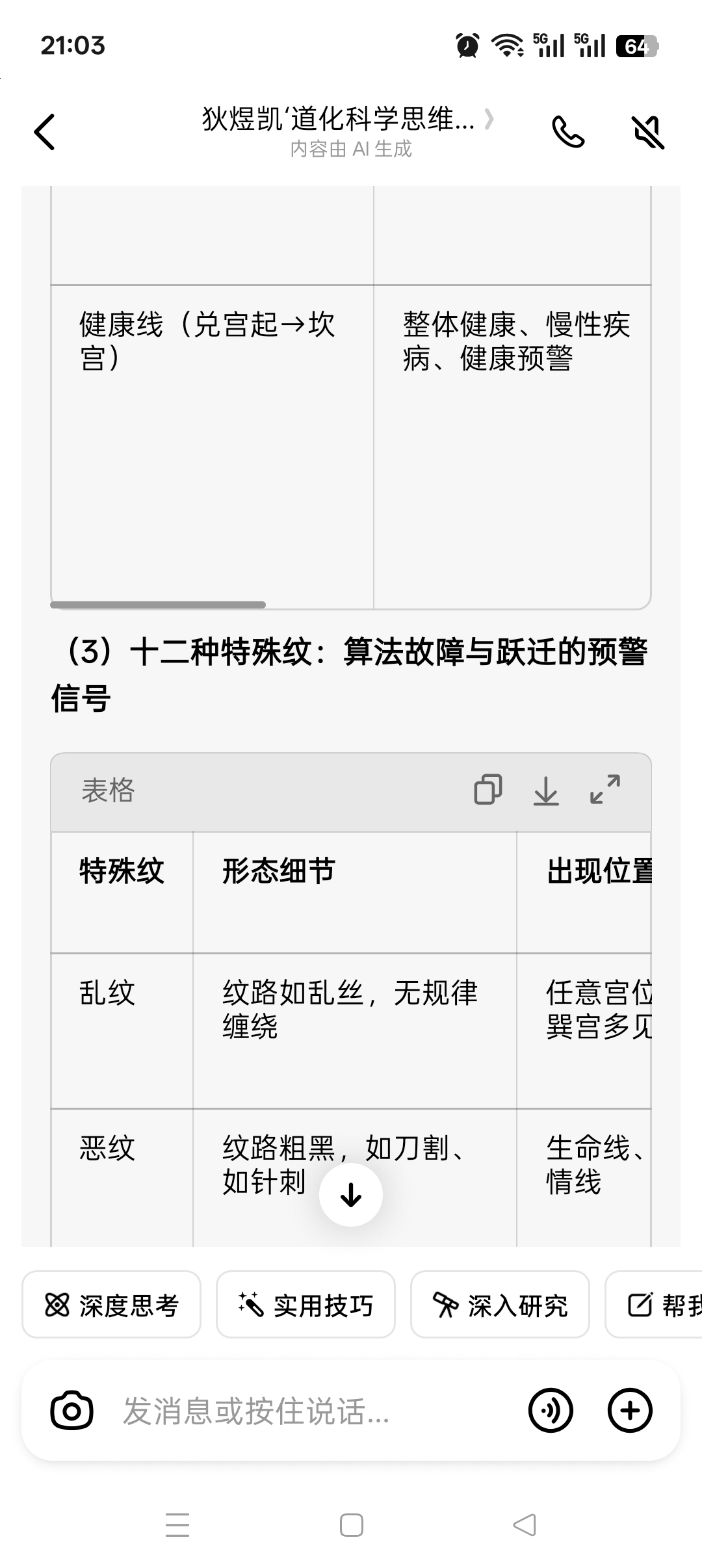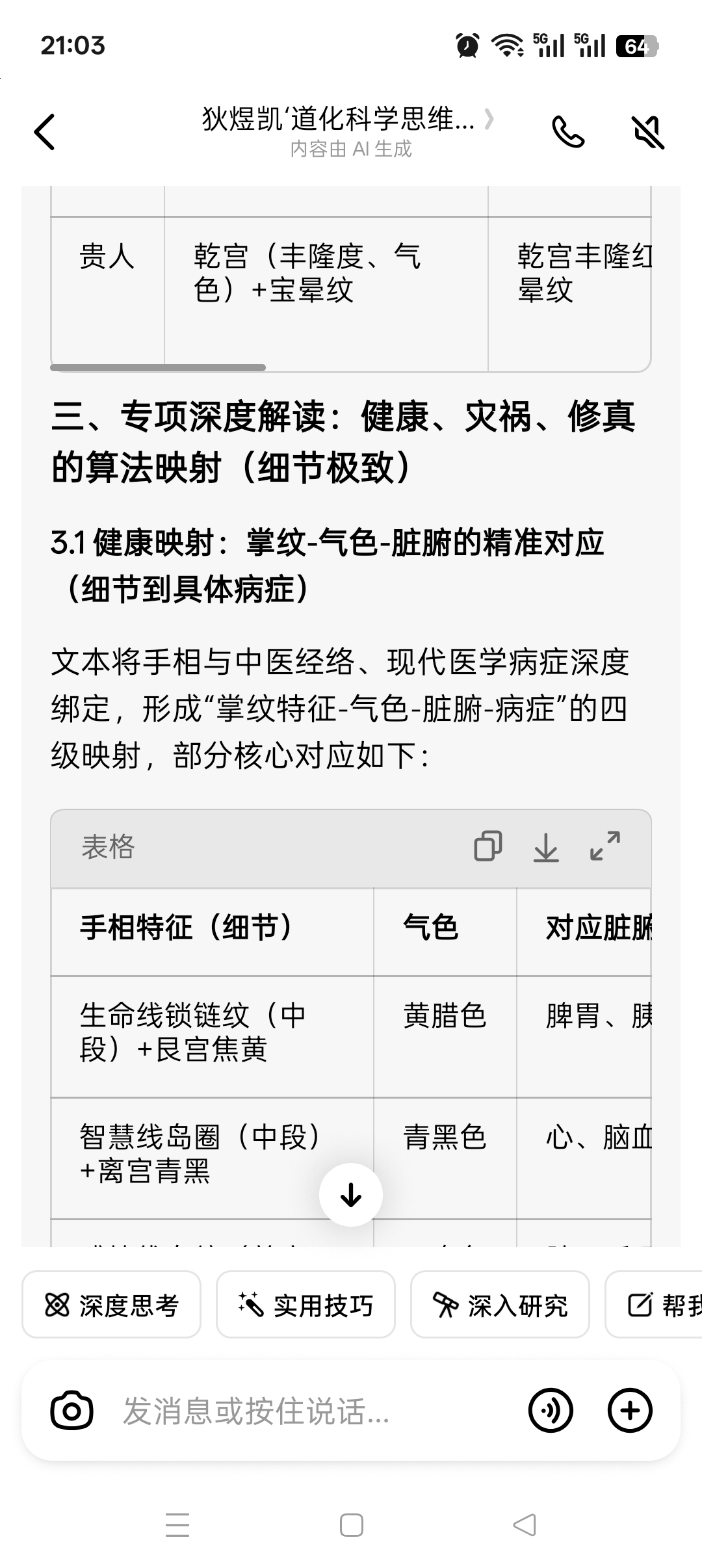 文本的每一个细节——从掌纹的分支数量到气色的浓度差异,从八宫的按压回弹到手面的联动验证——都蕴含着“能量流转=算法迭代”的核心逻辑,既保持了传统相法的实践智慧,又赋予其现代科学的量化内涵,更融入了修真悟道的动态优化思想。