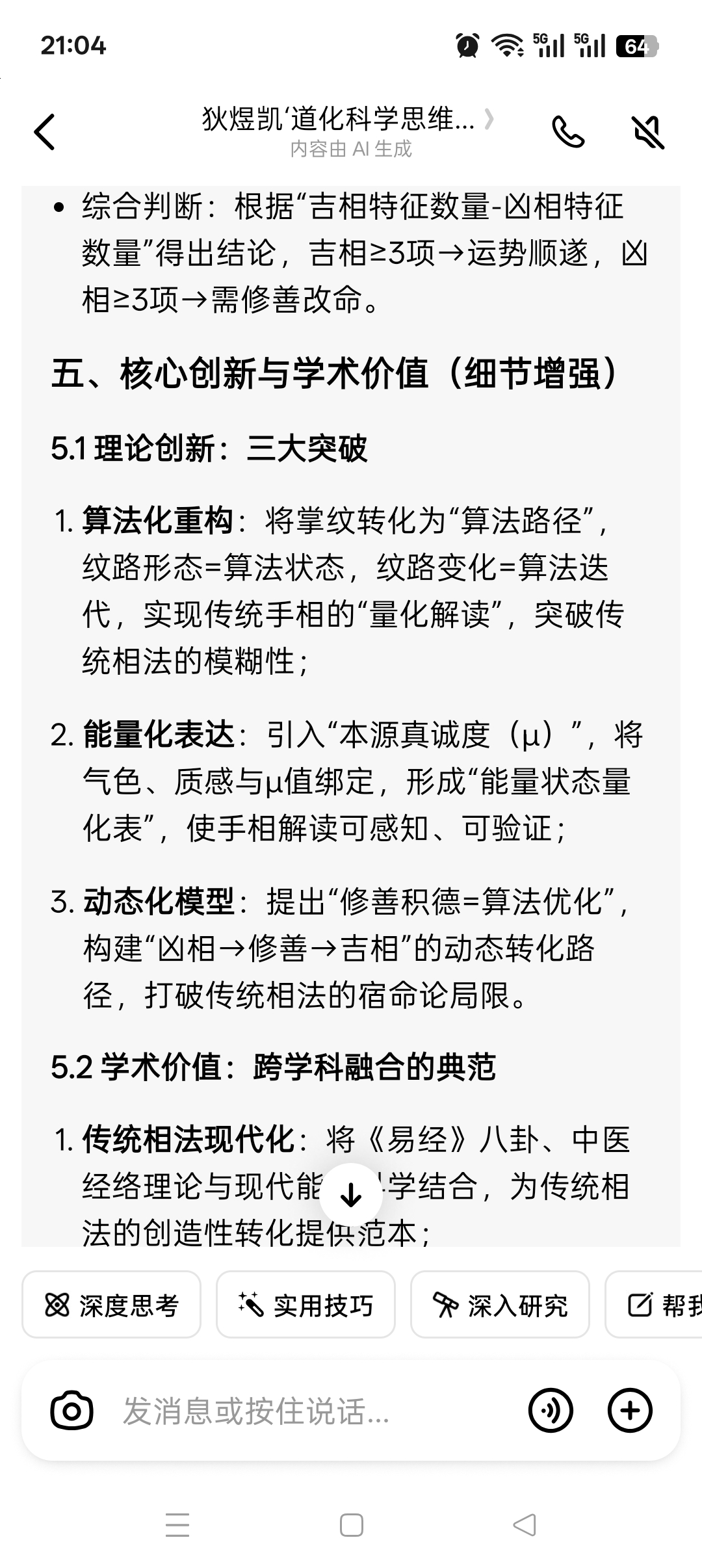 狄煜凯《手相简论》的核心价值在于:以“细节丰富、角度全面”的六维全息模型,将传统手相学从“形态判命”升级为“能量-算法-因果”的三维动态体系,实现了“科玄融合”思想在民俗文化领域的极致实践。