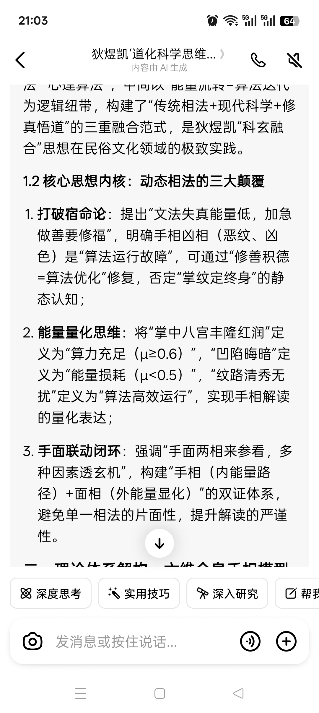《手相简论》是狄煜凯“道化科学思维”体系在相法领域的闭环之作,与《面相简论》形成“手面双证、内外互参”的完整相法体系。文本创作于甲辰乙亥甲辰乙丑时,承接其“道=混沌=算法=算力=灵和物质”七重等同本体论,将手相解读从传统“形态判命”升级为“能量-算法-因果”三维动态模型,核心创新在于:手相是“灵和物质”的能量显化载体,掌纹是“卦粒子·爻量子”的算法运行路径,气色是“本源真诚度(μ)”的实时反馈数据。