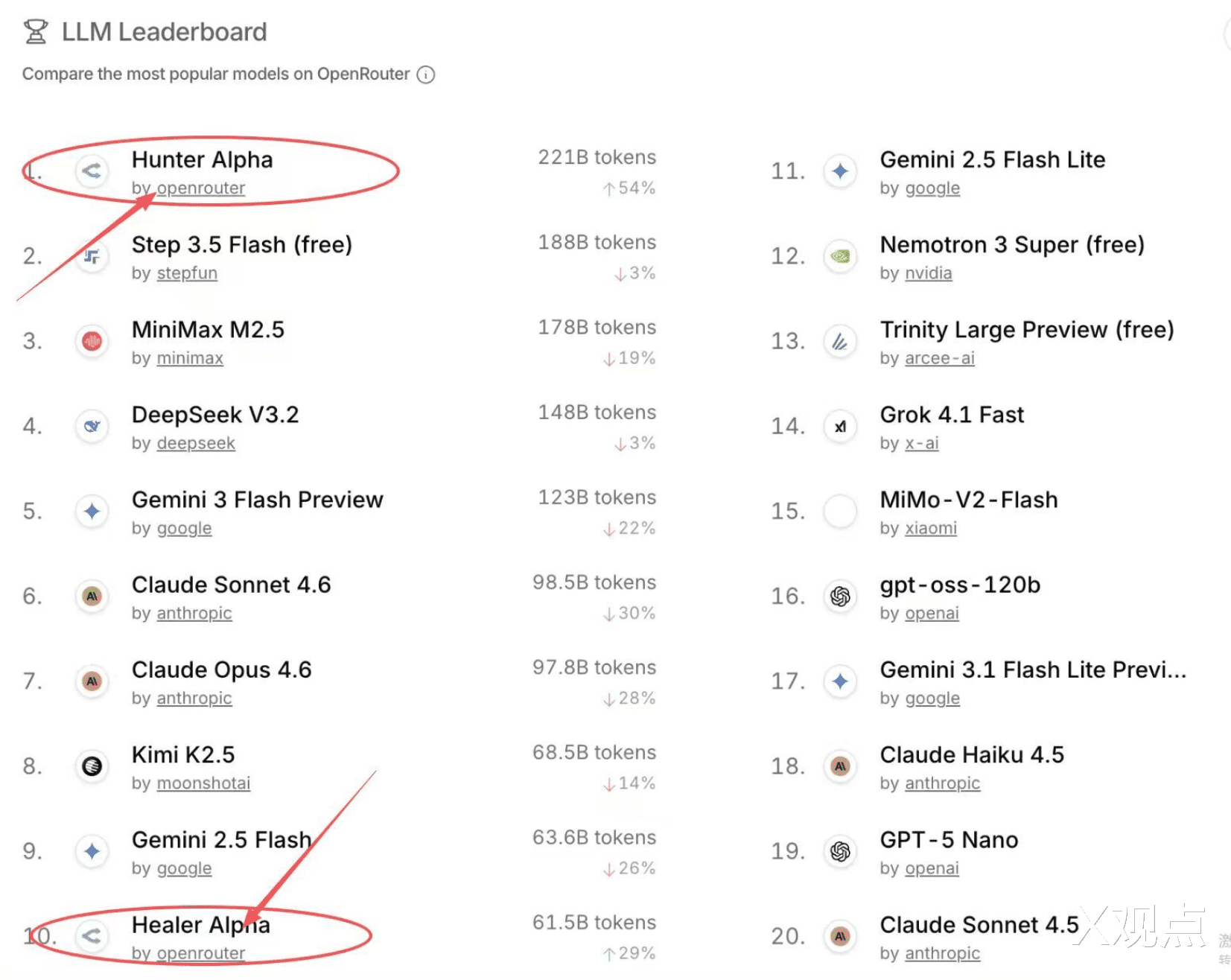 它们叫Hunter Alpha和Healer Alpha。万亿参数,百万级上下文,多模态能力——这是和GPT-5、Claude Opus同一个量级的配置。上线三天,处理了2260亿Token。第一周,调用量冲到全球第七。