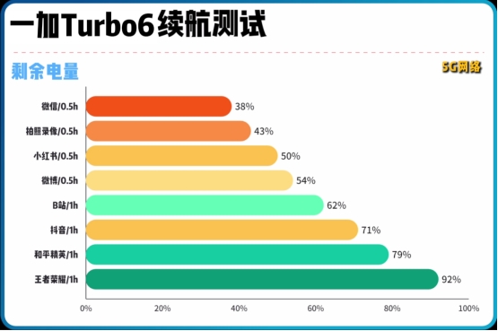 实测数据显示,重度日常使用可轻松实现一天一充。在6小时重度续航测试中,分别进行《王者荣耀》游戏、《和平精英》、抖音、B站各一小时以及拍照录像、微信、小红书、微博各半小时,最终剩余电量仍有38%。面对高强度的使用条件下,一加Tubro6的续航表现着实令人惊艳。若是正常使用,2~3天一充并非问题。