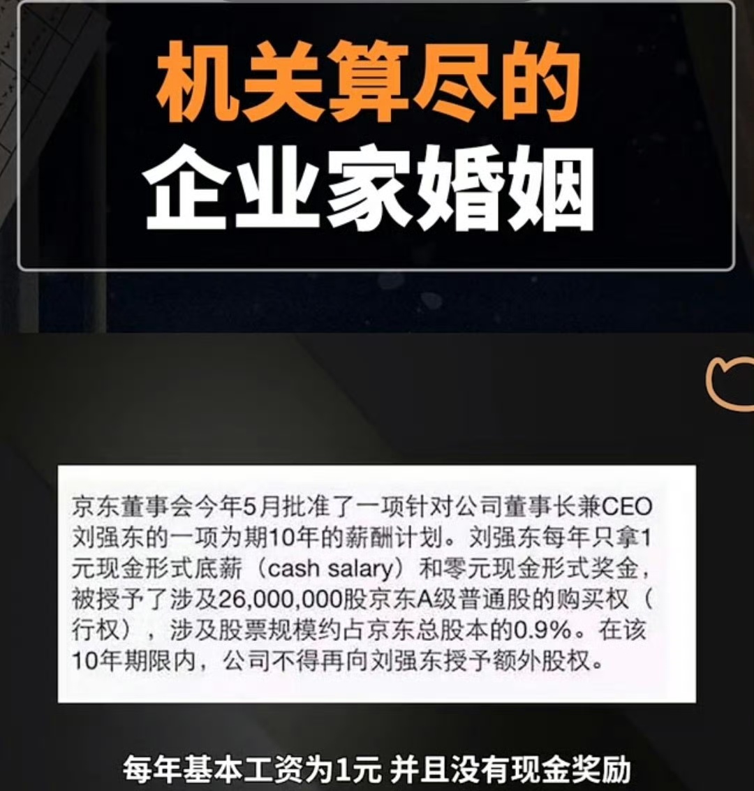当年刘强东的1元年薪计划,就曾被外界解读为“机关算尽的企业家婚姻”。