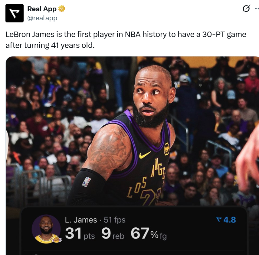 第一项:詹姆斯成为NBA历史上首位在41岁后,还能做到单场30+的球员。
