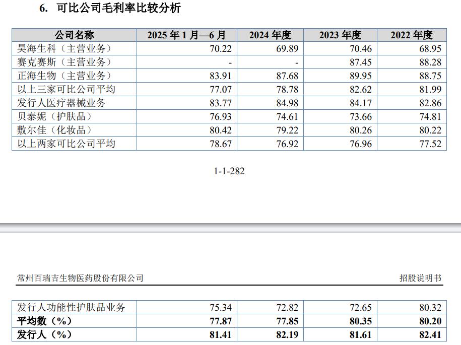 报告期内,发行人功能性护肤品毛利率分别为80.32%、72.65%、72.82%和75.34%。2022年毛利率较高,主要系2021年公司该业务处于起步和推广阶段,预计当年末的存货可变现净值较低,导致2022年销售的产品成本较低。随着业务规模增长,品牌逐渐成熟,毛利率逐渐回落,并稳定在70%以上。