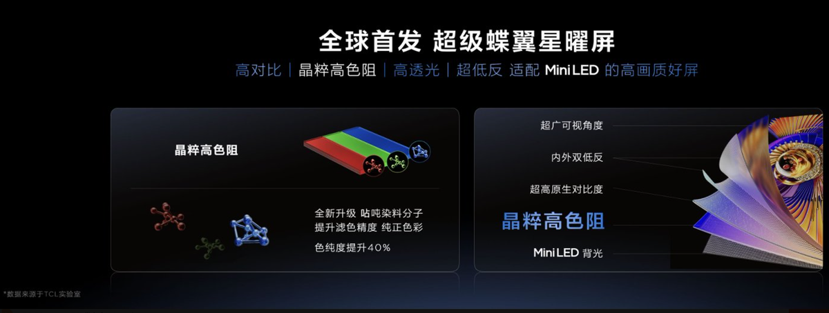 这次Q9M Pro不仅配置了超级量子点,还标配了TCL华星专为Mini LED定制的高画质屏:超级蝶翼星曜屏。量子点材料负责激发出更纯更准的三色光,超级蝶翼星曜屏负责过滤掉杂光,一个“做加法”一个“做减法”,配合下来色域自然就高了。