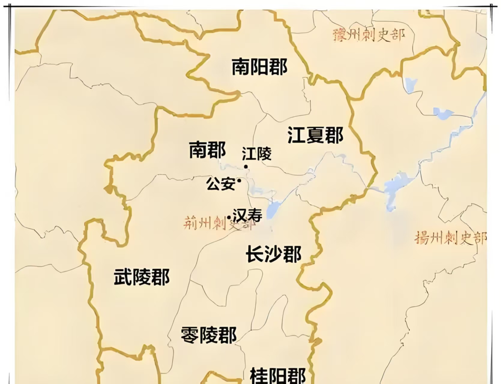 赤壁之战后,荆州地区被一分为三,曹操占据南阳郡和南郡北部,孙权占据南郡南部、江夏郡,刘备占据武陵、长沙、桂阳、零陵四郡。