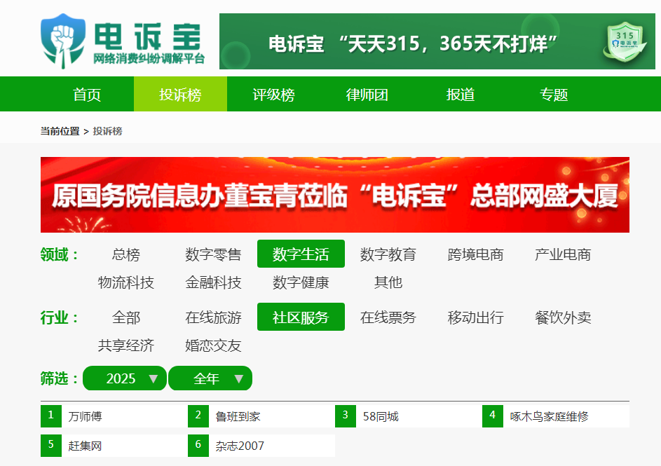 2025年至今,“电诉宝”受理投诉中涉及的数字零售领域二手电商用户有效投诉显示(依据投诉量排行),“58同城”排名第3位。最新评级为“不予评级”。除此之外,其他被投诉的类似平台还有:万师傅、鲁班到家、啄木鸟家庭维修、赶集网、杂志2007。