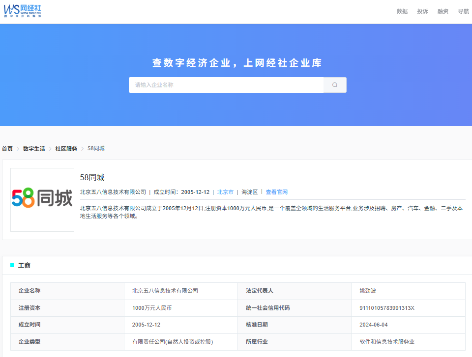 网经社企业库显示,“58同城”属于北京五八信息技术有限公司,成立于2005年,法定代表人为姚劲波。