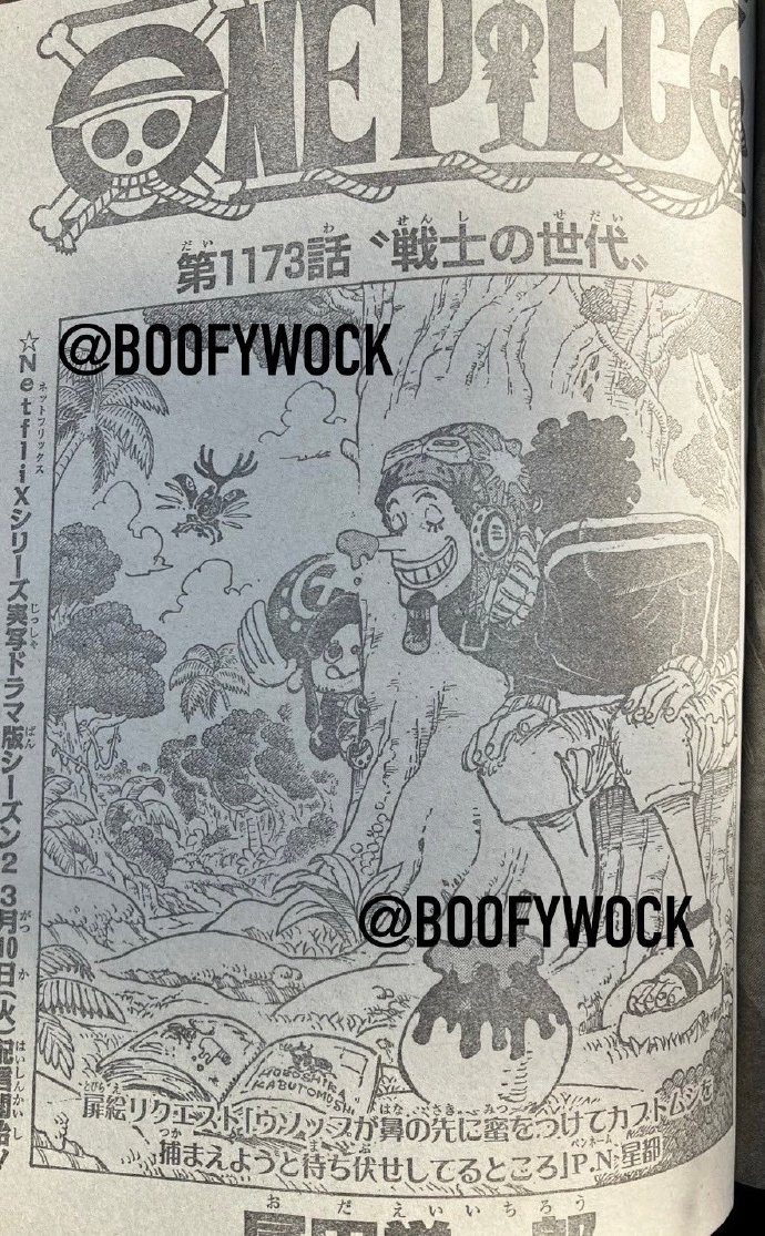 本周海贼王漫画1173话已经更新,本话标题为“战士的时代”。扉页则是乌索普用蜂蜜吸引甲虫!