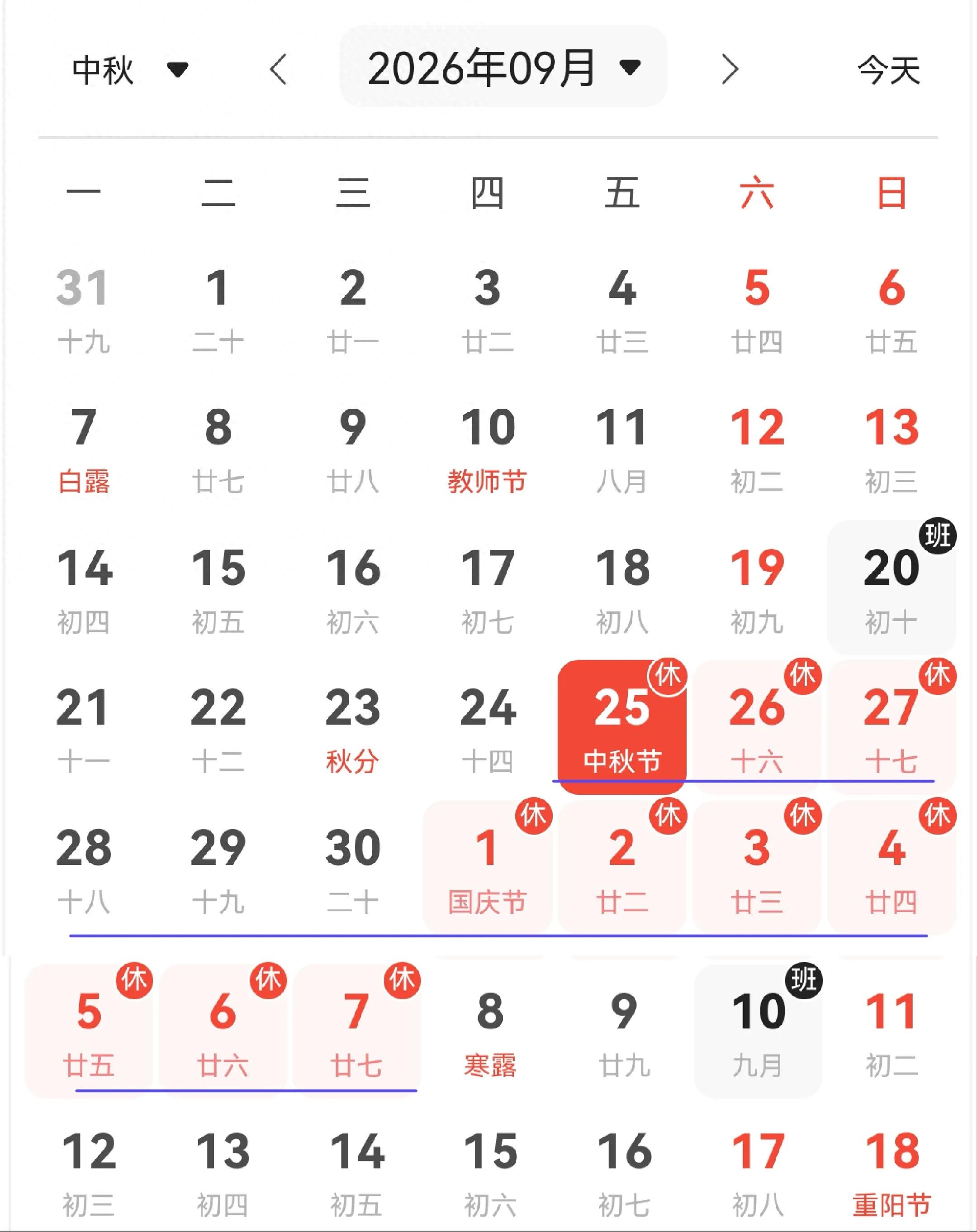 反观国庆,福利堪称“年度顶配”:2026年中秋放假3天(9月25-27日),国庆放假7天(10月1日-7日),合并共放假10天,只需在此基础上申请9月28日、29日和30日中间三天年假,就能衔接中秋+国庆的10天假期,最终解锁13天超长假期!