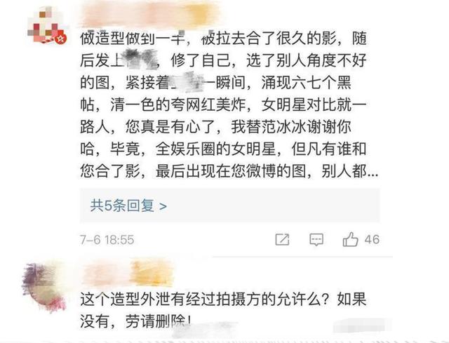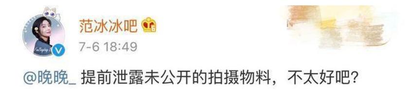 后来范冰冰官博发文指责晚晚一方不应该提前泄露拍摄物料,还有知情粉丝(应该是范冰冰团队人员)爆料,表示范冰冰造型做到一半的时候被晚晚拉去拍合照,并且故意挑选了几张最不利于范冰冰角度拍摄的照片,更夸张的是,明眼人都看得出来,该网红上传的照片只P了自己却没有给范冰冰修图,拉踩意味儿十分明显。更讽刺的是配文夸范冰冰美丽,明拉暗踩,心机实在可怕。