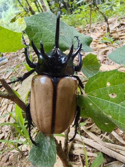细角疣犀金龟,又称五角大兜虫,体长50-55毫米,宽26—28毫米。雄虫背面隆拱,深棕褐色,触角10节,前胸背板甚隆拱,有前指强大的角突2对。雌虫无角突,体型略小于雄虫。以腐木和腐殖土为食,能促进其分解,在森林物质循环中具有重要作用,多栖息于森林环境中。主要分布于云南、广西等地。
