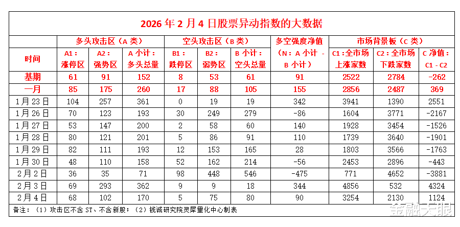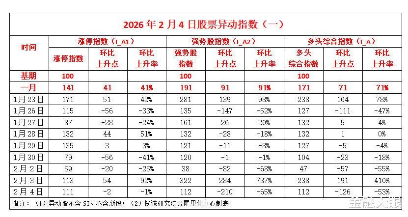 指数的计算基于一个科学合理的锚点——以2025年12月市场情绪平稳期的日均异动股数量为基准100点。今日指数的大幅下挫,意味着尽管绝对数量上仍有170只个股大幅上涨,但其强度与热度已远低于近期的正常活跃水平,市场“虚火”渐退。