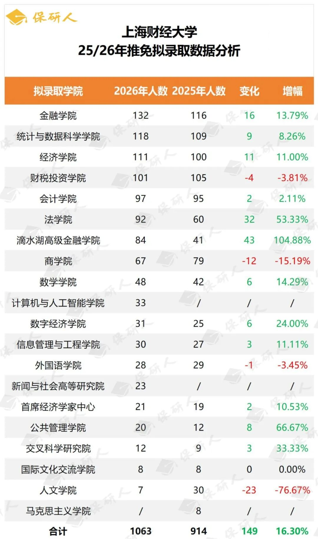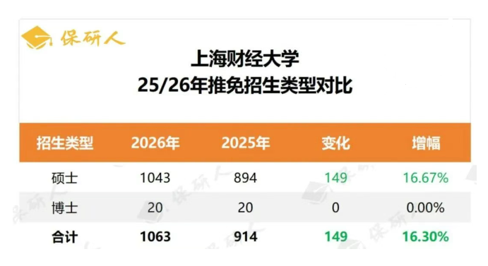 根据上海财经大学研究生院最新公示的《2026年推免生拟录取名单》,今年学校共拟录取了1063人,其中硕士1043人,直博20人。如果不去细究数据,你可能只觉得这是一个正常的招生体量,但如果我们将目光拉回到2025年,你会发现一个惊人的事实:在短短一年间,上财的拟录取总人数增加了149人,增幅高达16.30%。在如今研究生招生规模趋于稳定甚至部分高校开始“挤水分”的大背景下,接近两成的扩招幅度,简直就像是给处于焦虑中的学子们打了一针强心剂。这多出来的149个名额,每一个背后都可能是一个改变命运的伏笔,也是学校在向外界释放出的强烈求贤信号——上财正在张开怀抱,迎接更多有潜力的年轻人。