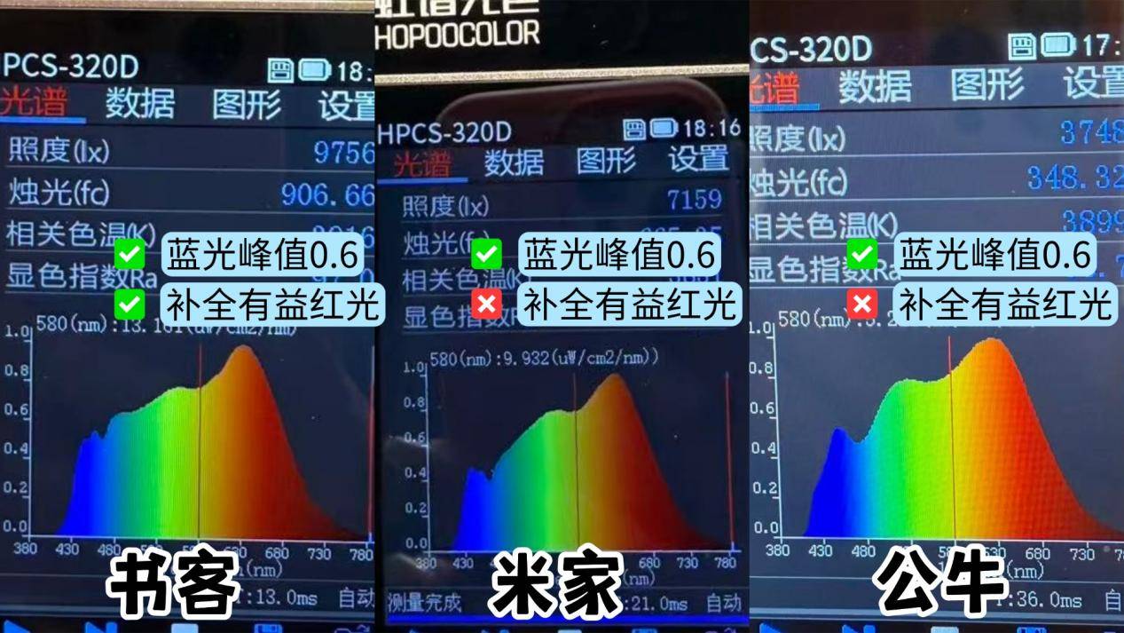 米家立式学习灯Pro:米家虽然在其他维度上表现相对一般,但是对于显色指数这个维度的表现是比较好的,实际显色指数在Ra98.2左右,实际光线不会失真。