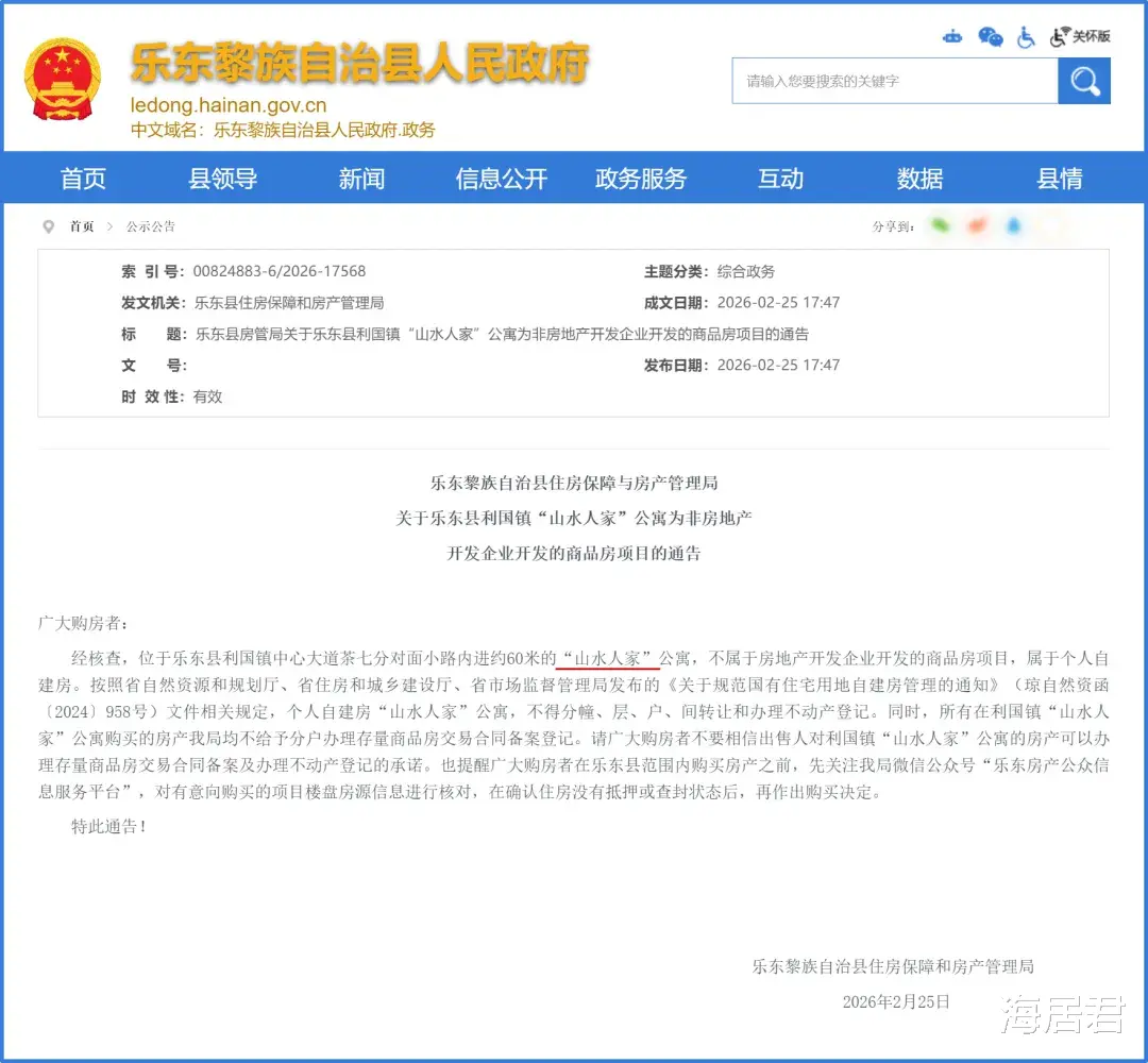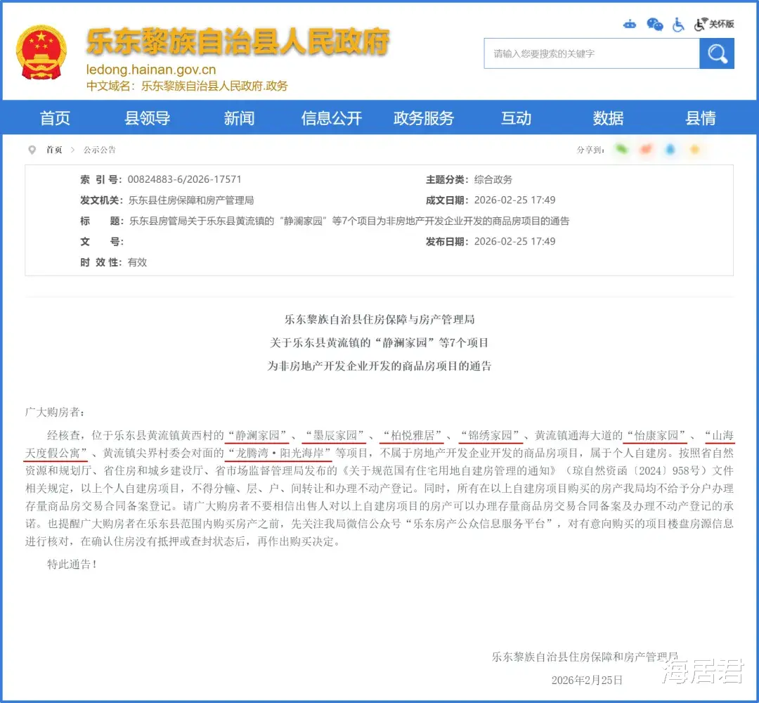 突发!2026年农历春节长假刚结束,海南省乐东县就发布多则通告,至少有8个住房项目被点名。