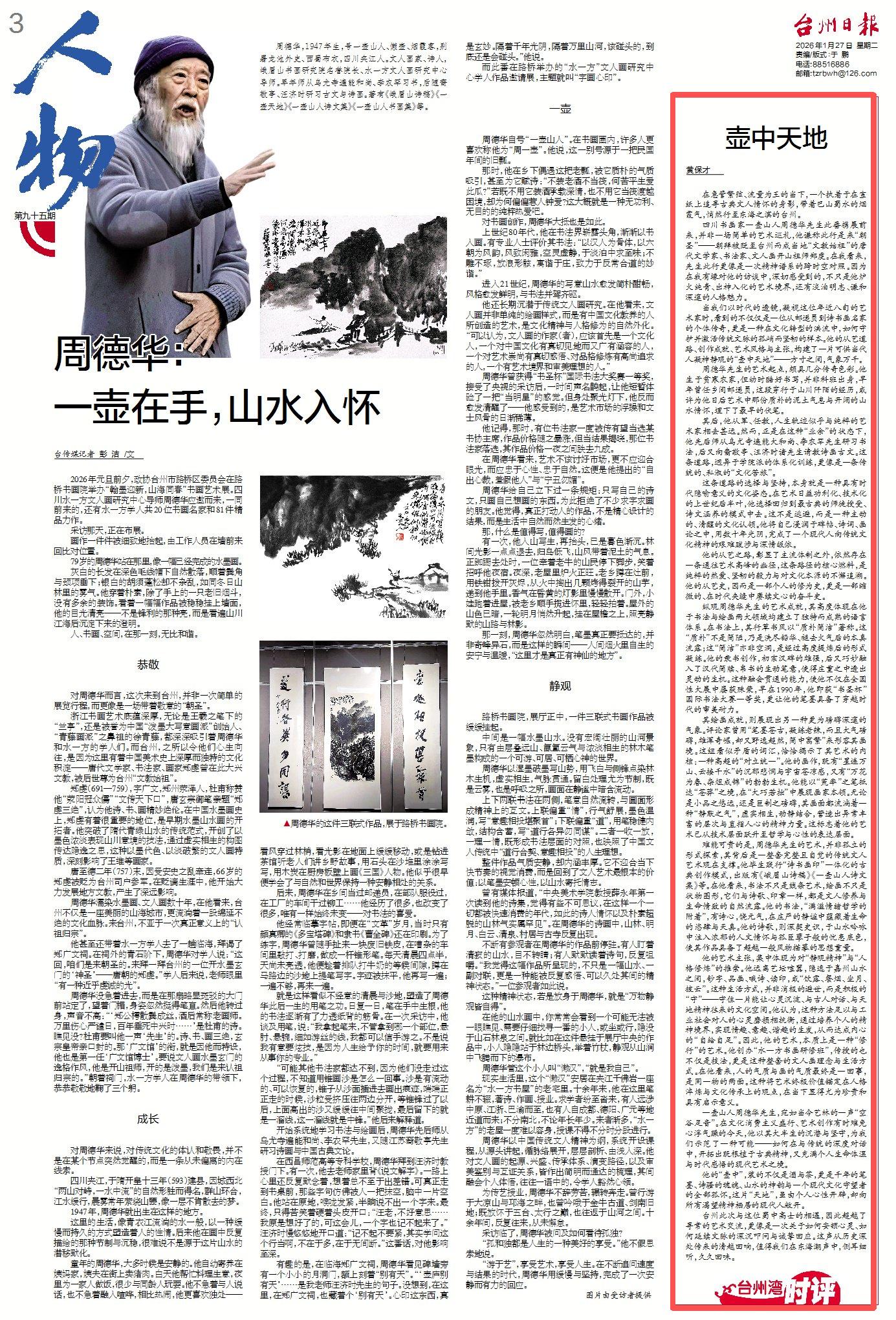 四川书画家一壶山人周德华先生此番携展前来,并非一场简单的艺术巡礼,他谦称此行是来“朝圣”——朝拜被贬至台州而成当地“文教始祖”的唐代文学家、书法家、文人画开山祖师郑虔。在我看来,先生此行更像是一次精神谱系的跨时空对照。因为在我有缘对他的访谈中,深切感受到的,不只是他炉火纯青、出神入化的艺术境界,还有淡泊明志、谦和深邃的人格魅力。
