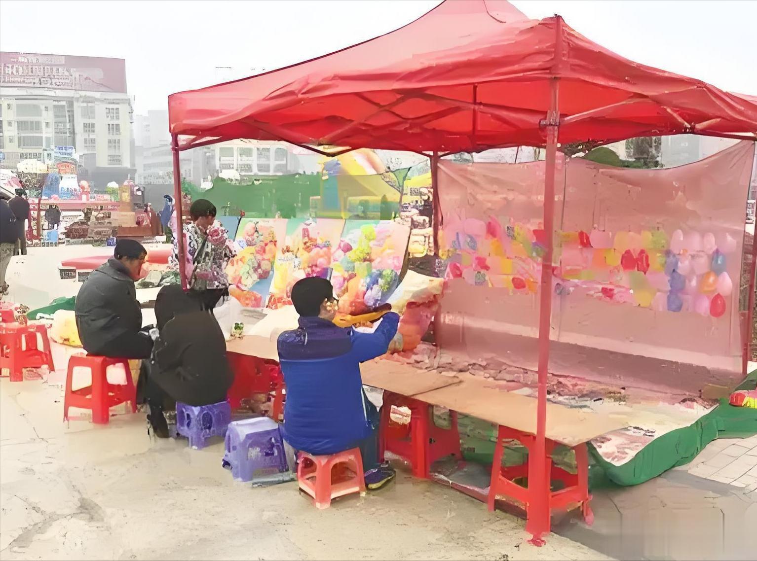 摊主只需置办几个气枪,搞一面泡沫板,吹几百个气球,或者用粉笔画几个靶子,就能在公园、夜市、庙会占据C位。