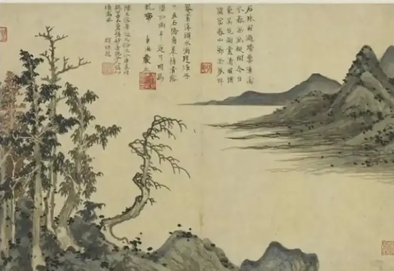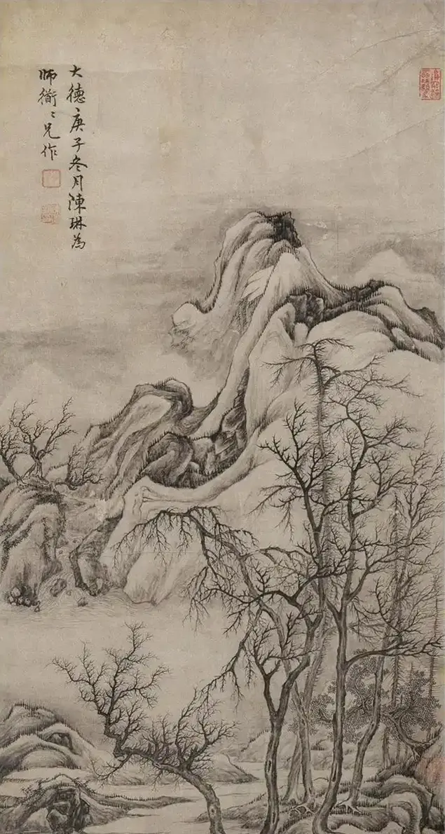 除花鸟题材外,陈琳在山水画领域亦有建树。传世之作如《秋山行旅图》《苍崖古树图》等,均以水墨写意为主,笔法苍劲简淡,意境幽远,进一步展现了其在多种画科中的卓越才华与全面修养。