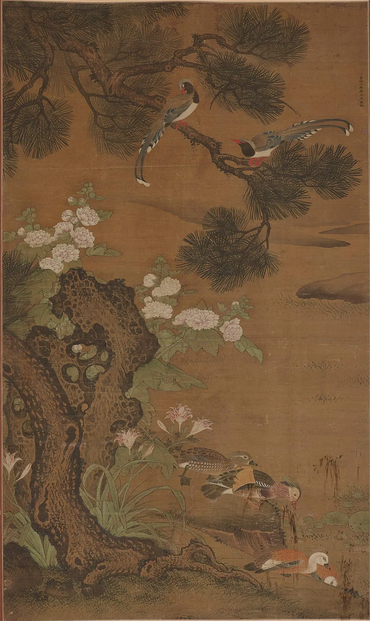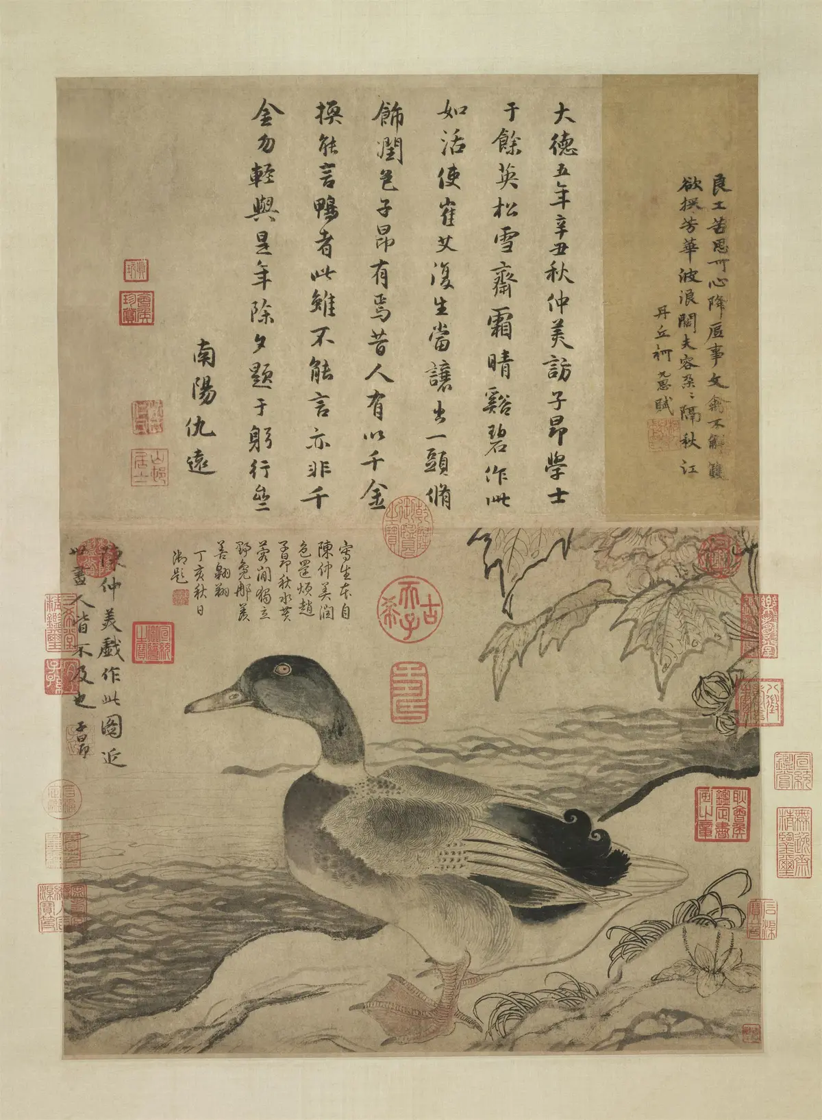 《溪凫图》不仅体现了陈琳个人的艺术造诣,更折射出元代花鸟画风的时代嬗变。在赵孟頫“复古”理念的引领下,元代画家逐渐摆脱南宋院体的精工细丽,转向注重笔墨意趣与文人情怀的表达。陈琳正是这一转变中的关键人物,其作品既承袭了两宋写生传统,又融入了水墨写意的抒情性,开启后世文人花鸟画的先声。