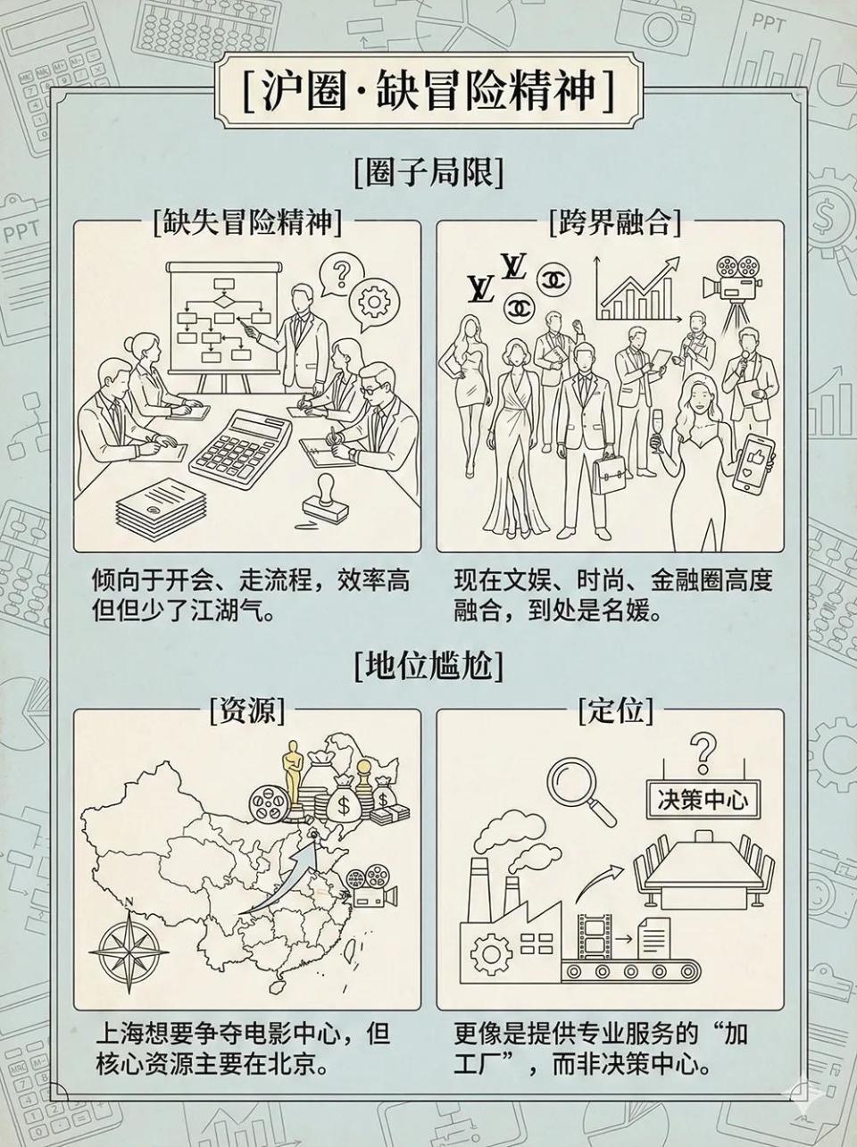 但,沪圈有自己的问题——缺少冒险精神。京圈的人可以为了一个项目喝酒喝到半夜,拍桌子谈钱,沪圈的人更倾向于开会讨论、做PPT、走流程。效率高,但有时候少了点江湖气。