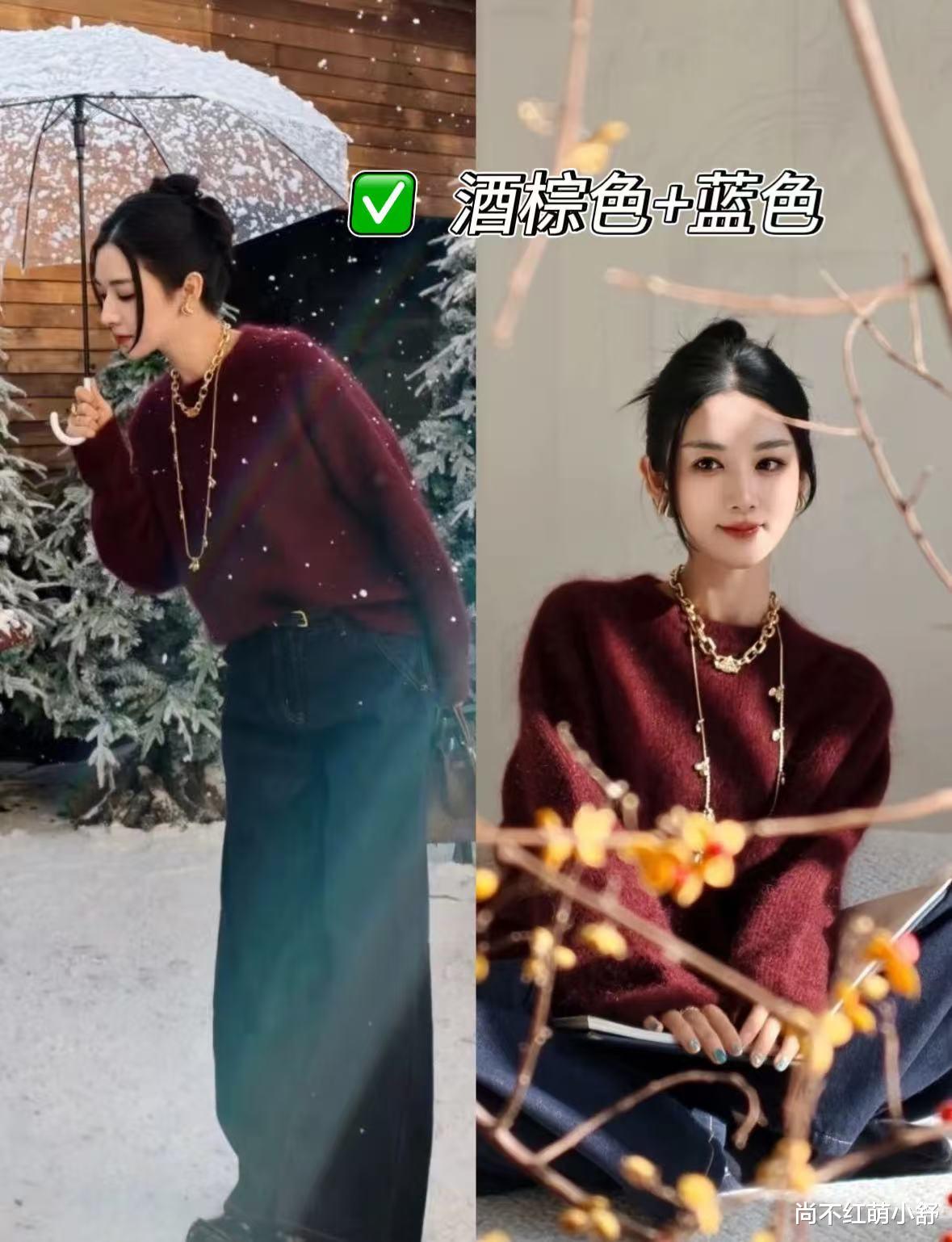 关键在饱和度和材质。放弃正红正绿,试试薇娅的这些色系。墨绿色上衣搭配牛仔裤,十分显显贵气;或者直接酒红色套装运动套装,温柔又气质,节日感有了,又不会太过。值得学习。