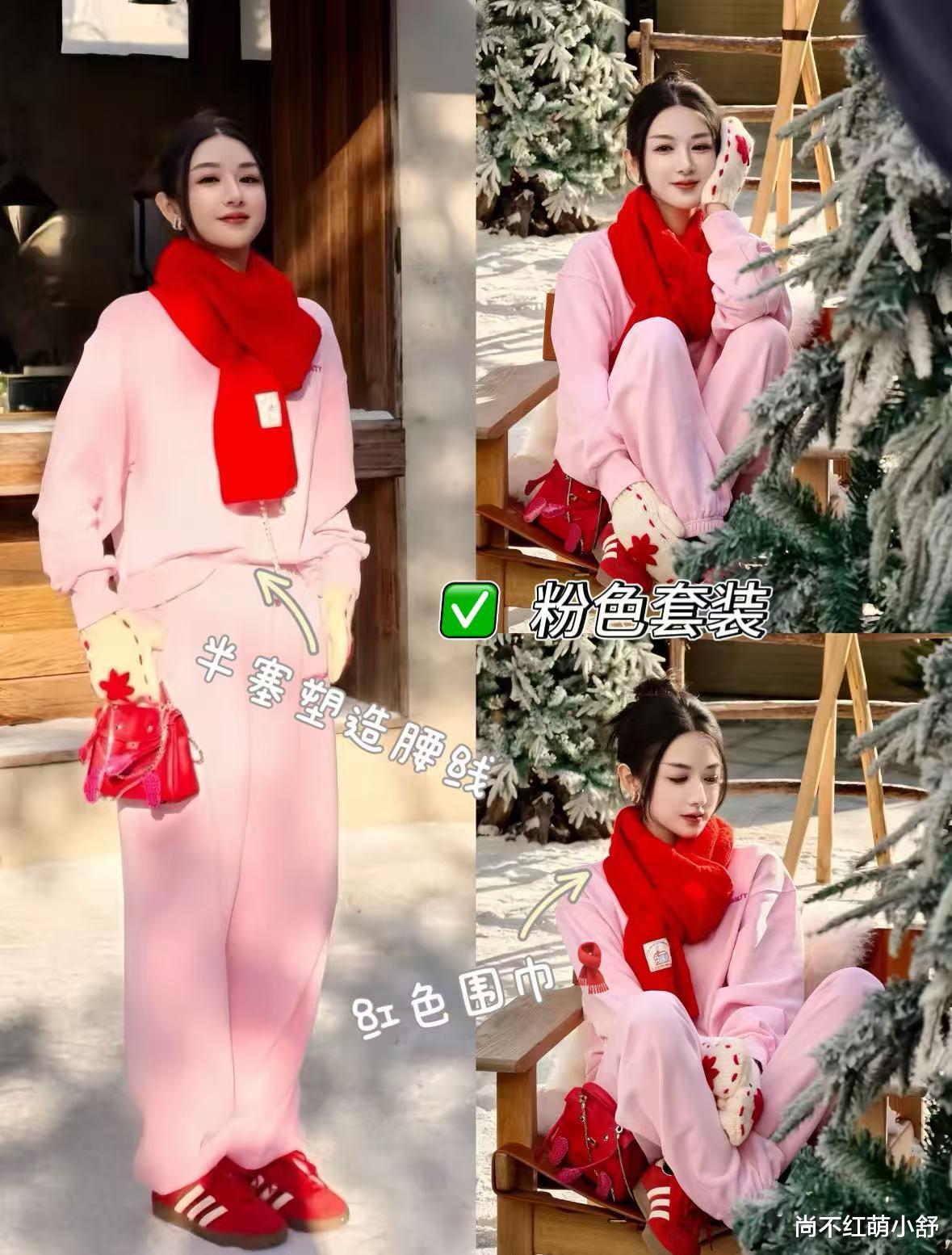 薇娅这套粉色同色系套装,用上衣半塞裤腰的小技巧打造高腰线,优化身材比例;搭配正红色围巾形成粉红撞色,提亮肤色又添节日氛围,再配上同色系红鞋、红包做呼应,整体色彩和谐又有层次,冬日休闲风也能穿出精致感与视觉焦点。
