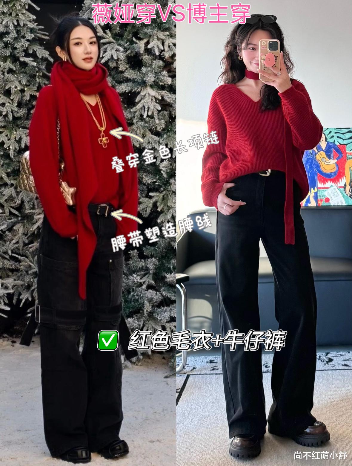 薇娅这套大红色的毛衣搭深灰色牛仔裤的穿搭,用红色毛衣+红围巾一体设计营造氛围感,红+深灰配色经典又吸睛;叠戴金色长项链打破红色的单调,增添精致细节;搭配金色链条包做金属元素呼应,让休闲风多了轻奢感,这样冬日穿红色也能兼顾保暖与时尚层次感。