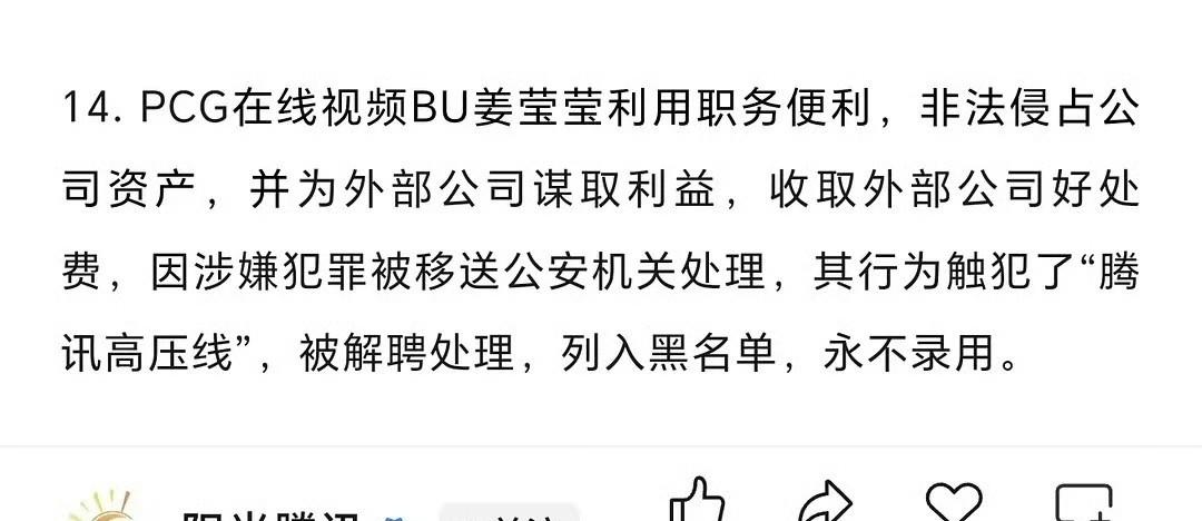 事情是这样,腾讯最新通报,2025年反腐持续加码,全年查处七十多起,解聘九十多人,二十多人移送警方,名单里有个熟脸,制片人姜莹莹,已被公司解聘,拉黑永不录用,同时移送公安,原因指向非法侵占公司资产,为外部公司谋利,收好处费,流程走完,人直接进司法程序