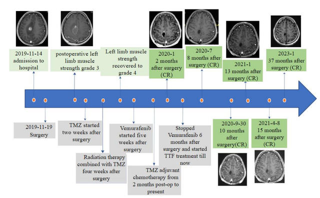 一位28岁的年轻患者,在经历左上肢抽搐、头晕后,被确诊为上皮样胶质母细胞瘤(WHO IV级)。在手术、放疗和化疗后,他使用了肿瘤电场治疗,无进展生存期达到了34个月,而且不良反应轻微。