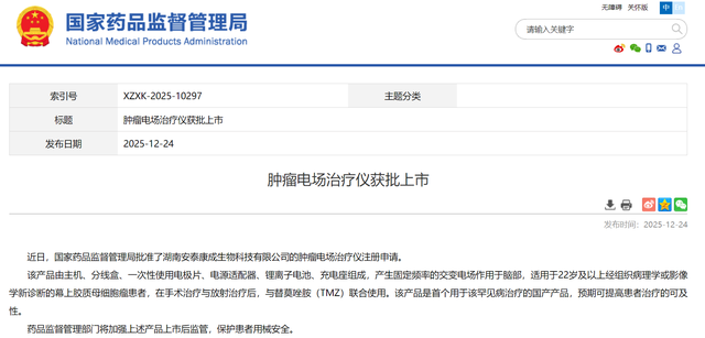 目前,国产肿瘤电场治疗仪已于2025年12月获国家药监局批准上市,适用于22岁及以上经组织病理学或影像学新诊断的幕上胶质母细胞瘤患者。