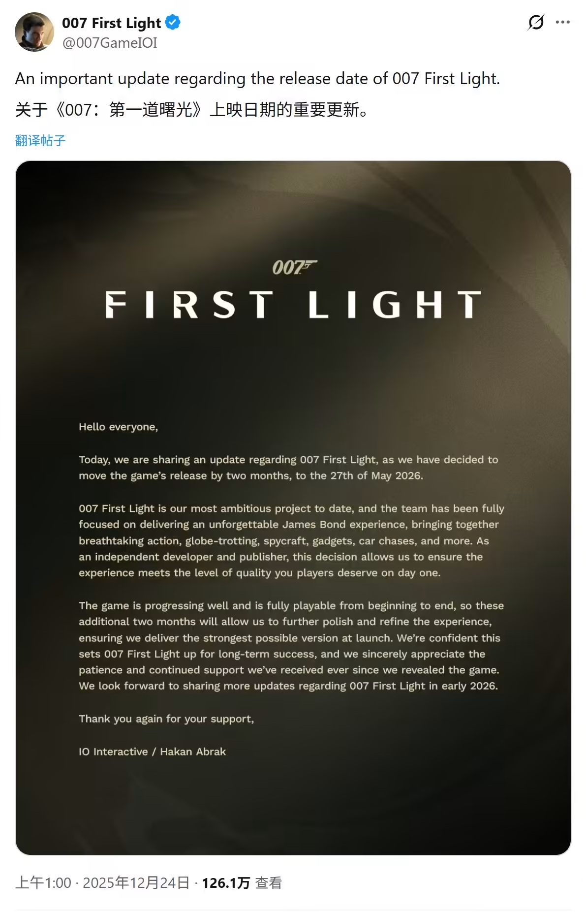 DoNews12月24日消息,《杀手》(Hitman)游戏开发商 IO Interactive 12 月 24 日宣布,将延期至 2026 年 5 月发行詹姆斯・邦德题材新作《007:初露锋芒》(007:First Light)。