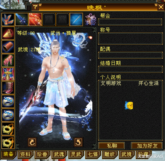 今天给大家介绍的是来自【半城烟沙】服务器一位88卡级武当,造型有多清凉,身上装备就有多“清凉”: